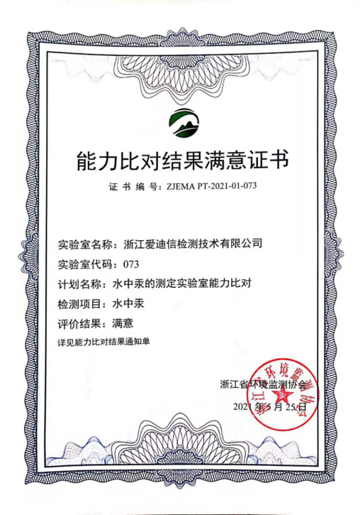 通过一个多月的漫长等待,我司正式收到了由浙江省环境监测协会寄来的能力比对结果满意证书,顺利通过了本次“水中汞”能力比对考核。